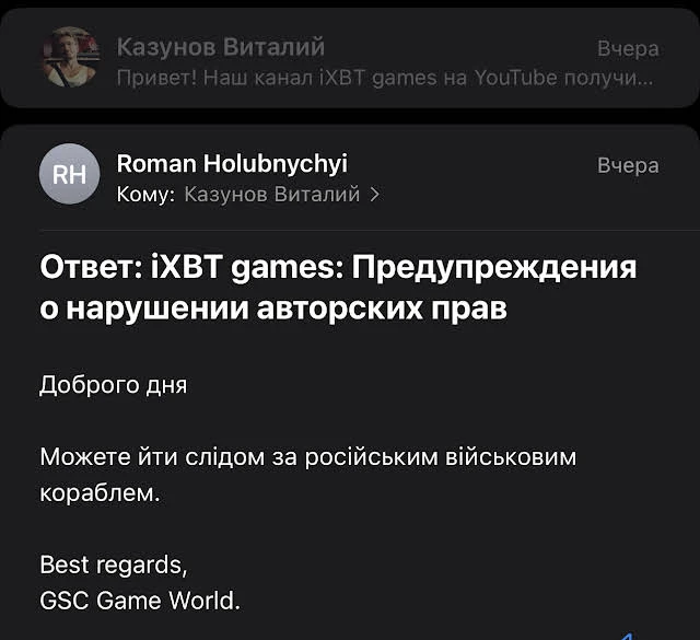 Но каким образом тогда некто Роман Голубничий с личного адреса электронной почты смог убедить Youtube в том, что у него есть права на S.T.A.L.K.E.R. 2: Heart of Chornobyl?