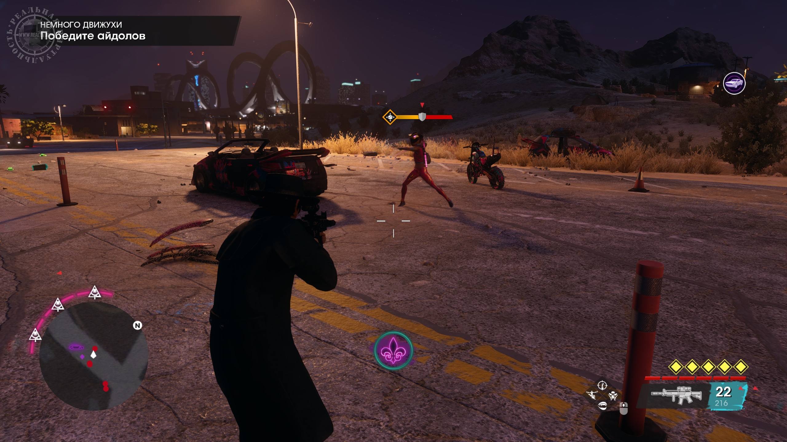 Санто-Илесо контролируют три крупные группировки – Айдолы, Лос Пантерос и Маршаллы. Первые анархисты и любят все яркое, вторые предпочитают мощные машины и рукопашный бой, а третьи вооружены и экипированы по последнему слову техники, в том числе технологиями, которым пока нет аналогов в реальности. За порядком же следят полицейские, тоже далеко не безобидные. Степень опасности в стычках поделена на пять делений и от их количества зависит, сколько противников будет пребывать на следующую волну, а когда враги окончательно разозлятся – появляется мини-босс, которого довольно сложно победить. Ассортимент как холодного, так и огнестрельного оружия в соответствующих магазинах богат, а за выполнение некоторых заданий и активностей дают уникальные экземпляры.