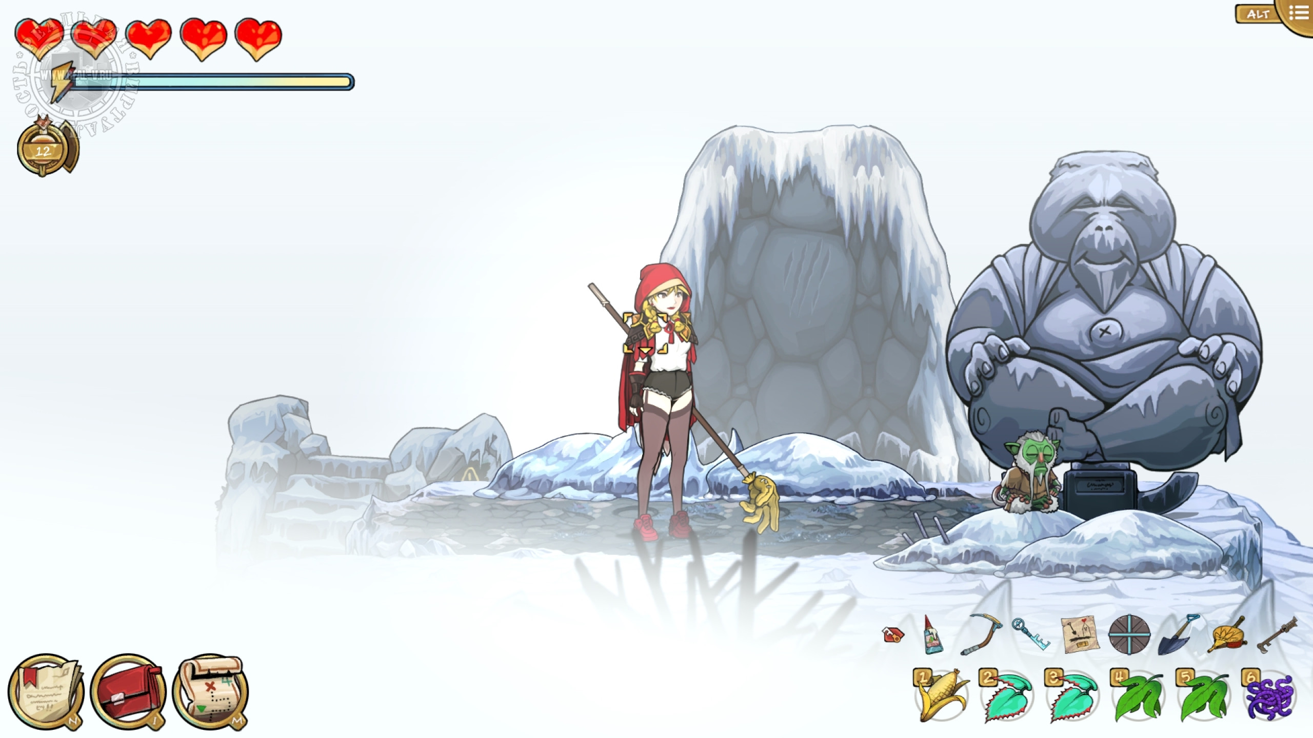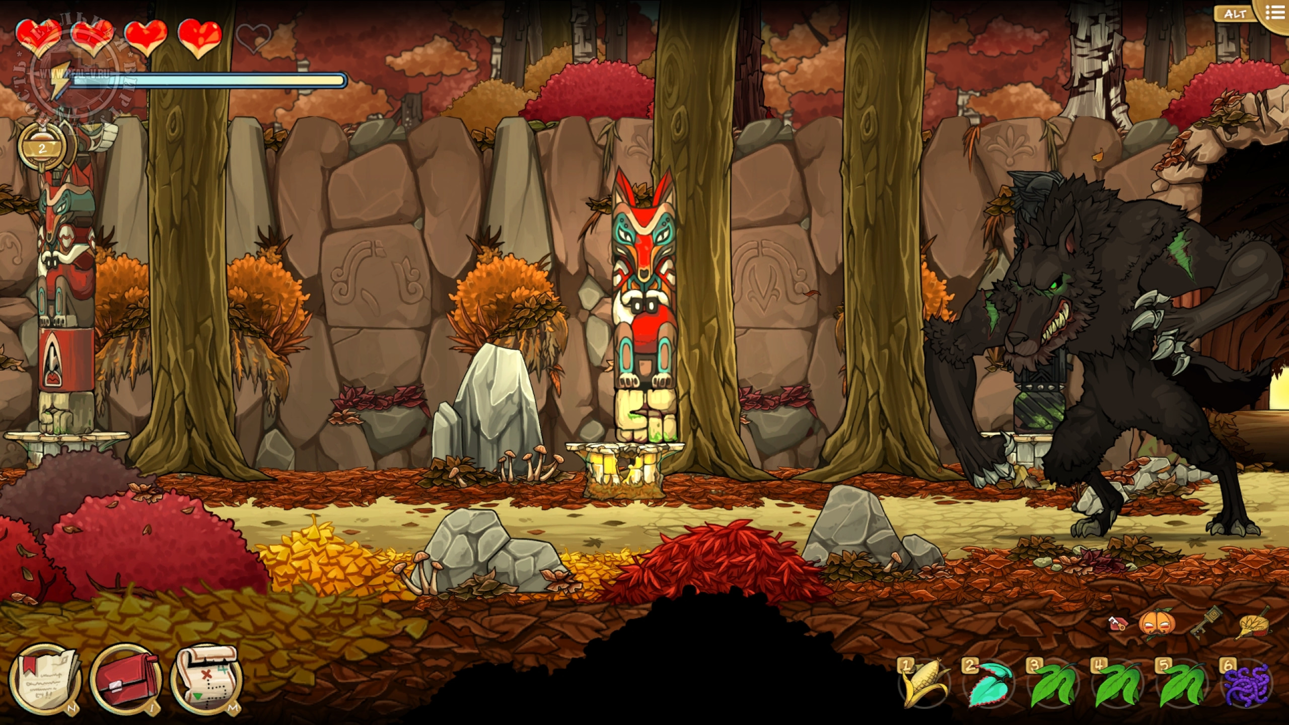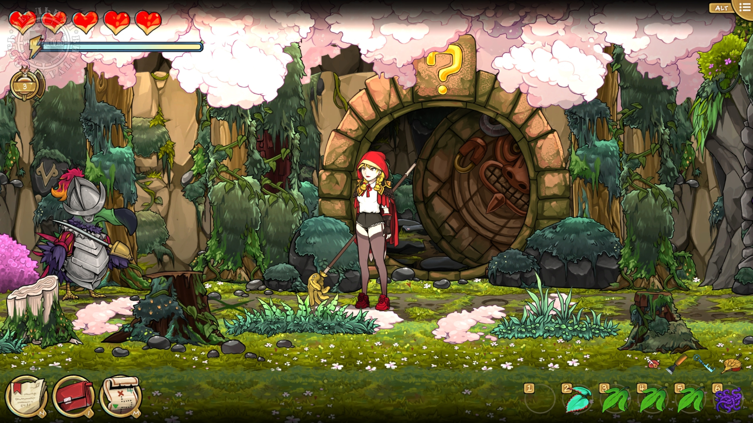Противники попадаются двух видов: обезьяны Мартышкины, стреляющие ядовитыми дротиками и птицы Додобо, ранящие саблей или копьем. Увернуться от их атак или нанести удар палкой-огревалкой не сложно и этому обучают перед первой попыткой нападения. Куда опасней Волчище – фамильяр Лефабы, который появляется, когда надо выполнить решающий квест на локации. Наверное, это отсылка к "Красной шапочке". Он будет преследовать главную героиню и наносить повреждения, ощутимо снижающие здоровье, но от него можно замаскироваться. Различные снадобья для восстановления самочувствия, выносливости и снятия последствий отравления покупаются у торговца за местную валюту – гульдены, либо находятся на территории, недостатка в деньгах или растениях нет.